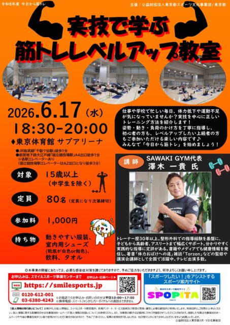 2026年6月17日(水)、東京体育館サブアリーナにて開催される東京都主催事業「実技で学ぶ 筋トレ レベルアップ教室」に、澤木一貴が講師として登壇いたします。